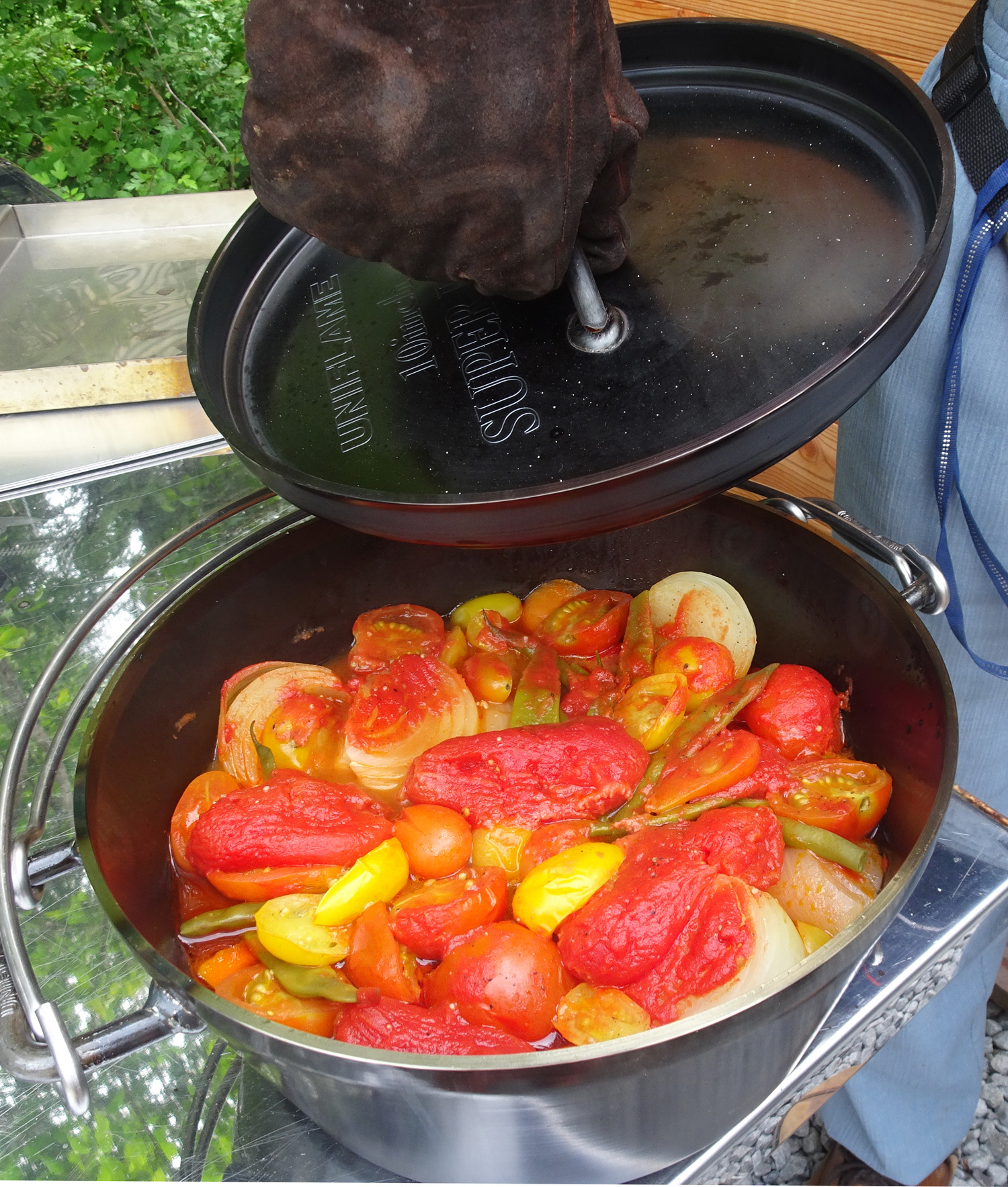 ダッチオーブンも鉄製にチェンジ。。。薪オーブンならではのギヤです。ローストチキンやローストビーフなど多彩な料理を体験することができます。寫眞は骨付きチキンのトマト煮です。鳥と野菜からの汁で出来上がる料理は抜群です。